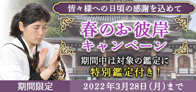 松田広子のサイトでは日頃の感謝を込めまして『春のお彼岸キャンペーン』を開催中。期間中は対象鑑定をご購入の皆様に、キャンペーン期間限定の特別鑑定をプレゼント。さらに、皆様がこの先も善行を積んで行けるように『春のお彼岸祈祷』を捧げさせていただきます。ぜひこの機会にご利用ください。