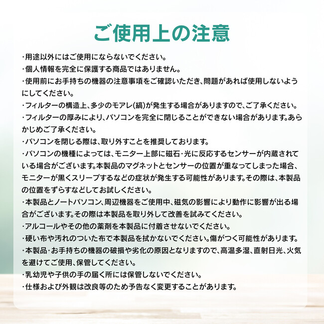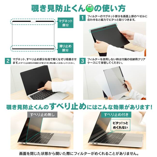 覗き見防止くんは従来のマグネット式プライバシーフィルターであった”開閉時のめくれ”や”磁石が弱いことによる貼り付けにくさ”などを改善したフィルムです。