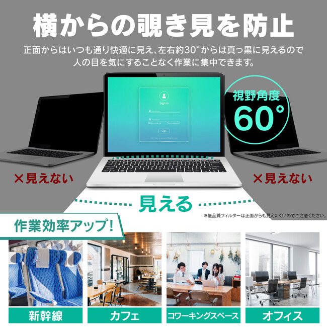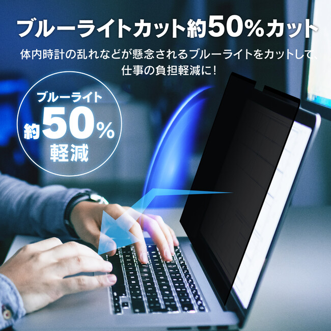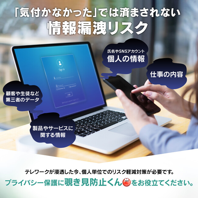 テレワークの普及で増えた外出先でのPC作業。以前より格段に個人情報漏洩リスクが高まっています。【覗き見防止くん】は視野角度60°のスクリーンが覗き見を防止、ブルーライトカットも兼ね備えたシリーズです。