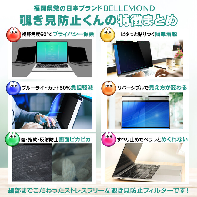 Fun Standard株式会社(本社:福岡県大野城市)が展開するモバイルアクセサリーブランド「BELLEMOND(ベルモンド)」はマグネット着脱式で簡単に取り外しできるプライバシーフィルター「覗き見防止くん」シリーズを発売しました。「使いたい時だけ簡単着脱」「めくれあがるのを防止するすべり止め付き」「ブルーライトカット約50%」「グレア・アンチグレアのリバーシブル仕様」「反射・傷・指紋から画面を保護」などを兼ね備えたフィルムです。2023年3月31日よりAmazon・楽天で発売記念特価にて販売開始です。価格はベルモンドのチラシページにて。