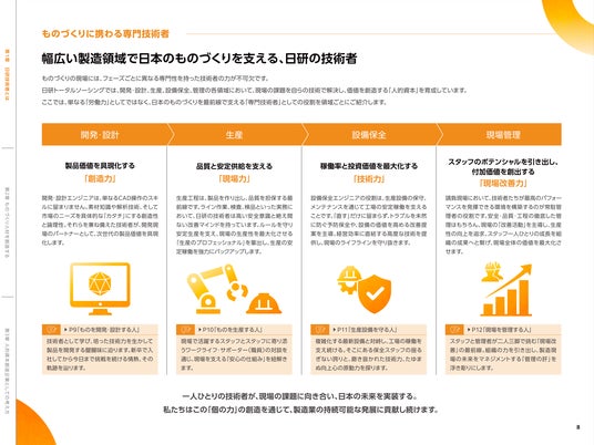 本レポートでは、製造業において当社がどのような役割を担っているかを役員インタビューとともに紹介。さらに「ものを開発・設計する人」「ものを生産する人」「生産設備を守る人」「現場を管理する人(常駐管理者)」の4つの視点から、現場で活躍するスタッフやそれを支えるワークライフ・サポーターのインタビューを通じて、リアルな現場の声をお届けします。また、各領域に対応するエンジニア研修センター、ものづくり技能センター、保全テクノセンターについて、就業前研修や専門研修などの研修カリキュラムをはじめ、当社独自の研修への取り組みを紹介しています。
