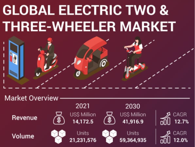 ASTUTE ANALYTICAが2022年3月15日に発表した新しいレポートによると、2021年の世界の電動2輪・3輪車市場では、2輪車セグメントが最高のシェアを占めており、さらに予測期間中もその優位性を維持すると推測されています。