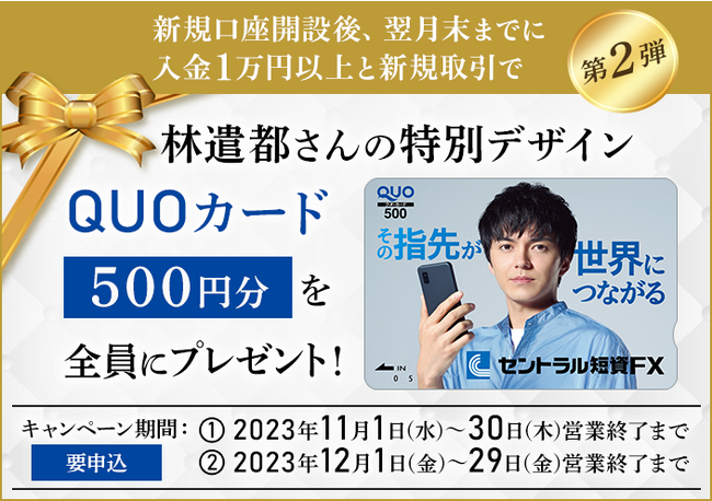 セントラル短資FX株式会社(本社:東京都中央区、代表取締役社長:宮下 俊郎)は、11月と12月に、林遣都さんQUOカードプレゼント新規口座開設キャンペーンを実施します。