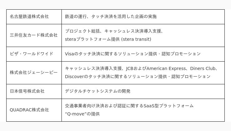 名古屋鉄道株式会社(本社:愛知県名古屋市、代表取締役社長:高崎 裕樹)、三井住友カード株式会社(本社:東京都江東区、代表取締役社長:大西 幸彦)、ビザ・ワールドワイド・ジャパン株式会社(本社:東京都千代田区、代表取締役社長:シータン・キトニー)、株式会社ジェーシービー(本社:東京都港区、代表取締役兼執行役員社長:二重 孝好)、日本信号株式会社(本社:東京都千代田区、代表取締役社長:塚本 英彦)、QUADRAC株式会社(本社:東京都港区、代表取締役社長:高田 昌幸)は、2024年春より、名古屋鉄道の一部駅でタッチ決済対応のカード(クレジット、デビット、プリペイド)や、同カードが設定されたスマートフォン等を活用した、改札における運賃の支払いに関する実証実験を実施することについて、以下の通りお知らせします。