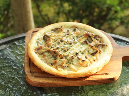 舞茸、椎茸、ぶなしめじ、エリンギの4種類のきのこと、きのこ出汁マヨできのこ尽くしのピザが登場。みりんの優しい甘さが隠し味です。