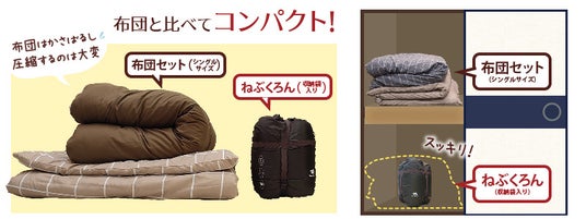 「ねぶくろん」は専用のしろくまん圧縮袋を使って小さくでき、「しきろーるん」は空気を抜きロール状にすることで横にも縦にもコンパクトに収納することができます。