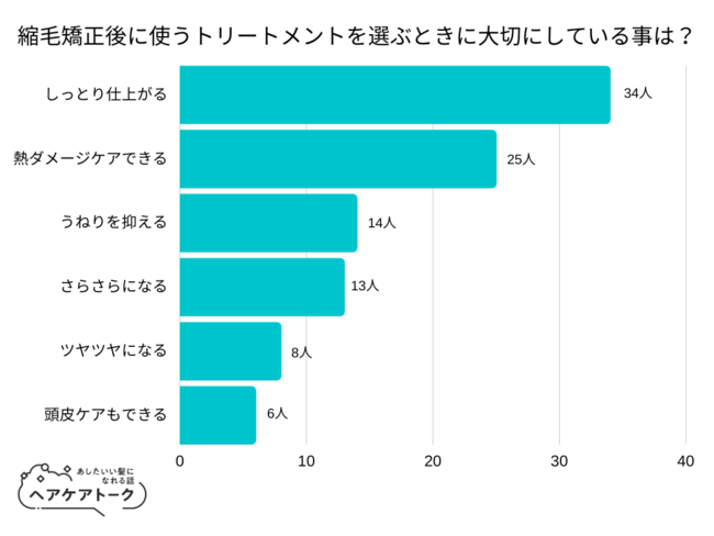 「縮毛矯正後に使うトリートメントを選ぶときに大切にしている事は?」とアンケート調査した結果、1位は『しっとり仕上がる』でした。
