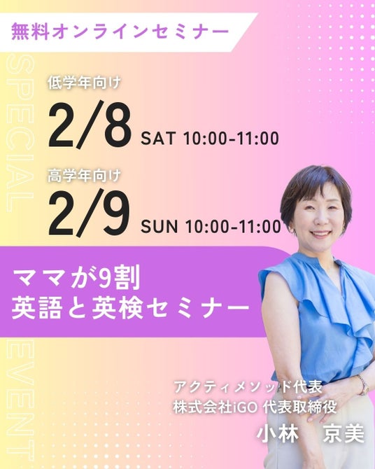 本セミナーでは、アクティメソッド創設者であり、株式会社iGO代表取締役も務める小林京美が、長年培ってきた英語教育のノウハウを惜しみなくお伝えします。