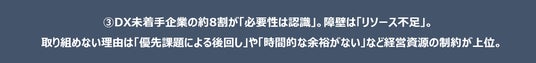 3.DX未着手企業の8割が「必要性は認識」。障壁は「リソース不足」。