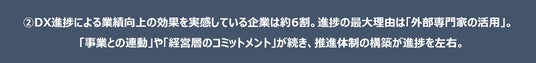 2.DX実践企業の6割が「業績向上」を実感。進捗の最大理由は「外部専門家の活用」。