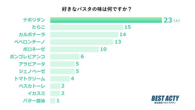 好きなパスタの味について100人にアンケートを行ったところ、「ナポリタン」と回答する人が最も多い結果となりました。