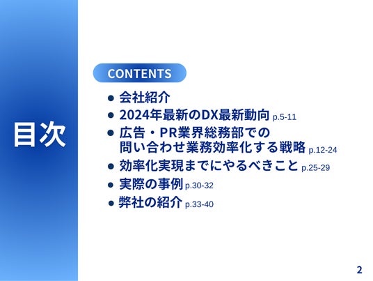 株式会社ベクトル(本社:東京都港区、代表取締役会長兼社長:西江 肇司、東証プライム:6058)の子会社であるOwned株式会社(東京都品川区、代表取締役社長、石井翔、以下「当社」)は、DXの最新トレンドをまとめた「広告・PR業界総務部向け|問い合わせ業務を効率化する5つの戦略レポート」の2024年7月版(全40ページ)を無料公開いたしました。