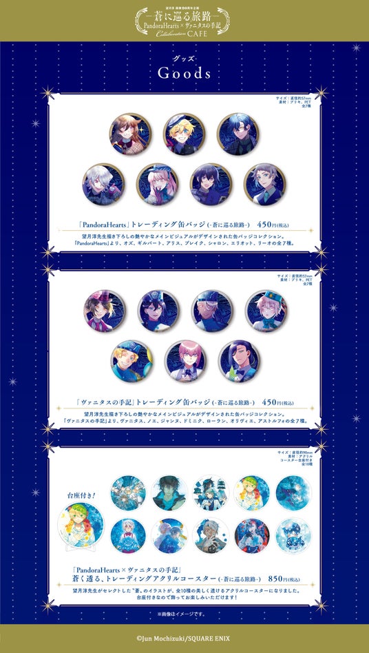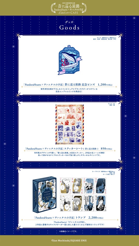 「望月淳画業20周年企画 -蒼に巡る旅路- PandoraHearts×ヴァニタスの手記」コラボカフェで販売されるグッズラインナップをご紹介いたします。