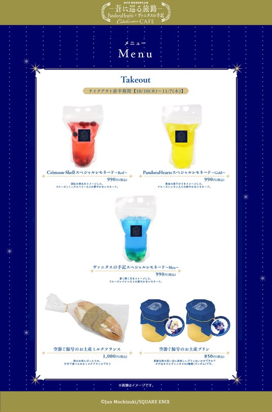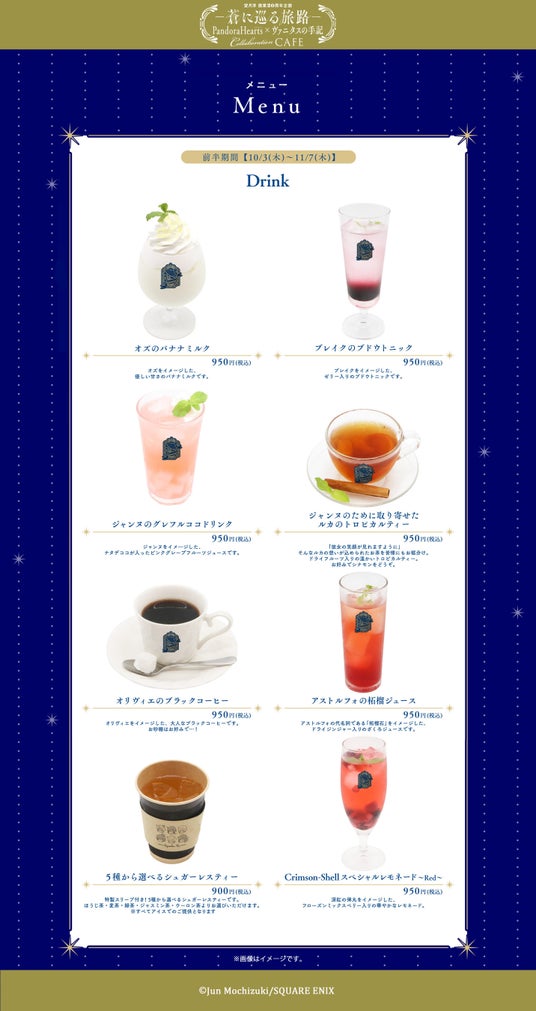 「望月淳画業20周年企画 -蒼に巡る旅路- PandoraHearts×ヴァニタスの手記」コラボカフェで前半期間(10月3日(木)~11月7日(木))に提供するメニューをご紹介いたします。