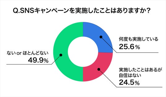 「【キャンつく】Xキャンペーン企画診断」では、各社が抱えるSNSキャンペーン課題も分析しました。SNSキャンペーンについて、実施経験がないのは49.9%、実施したものの思うような成果を得られていないのは24.5%と、約3/4の企業がSNSキャンペーンを活用できていない状態です。