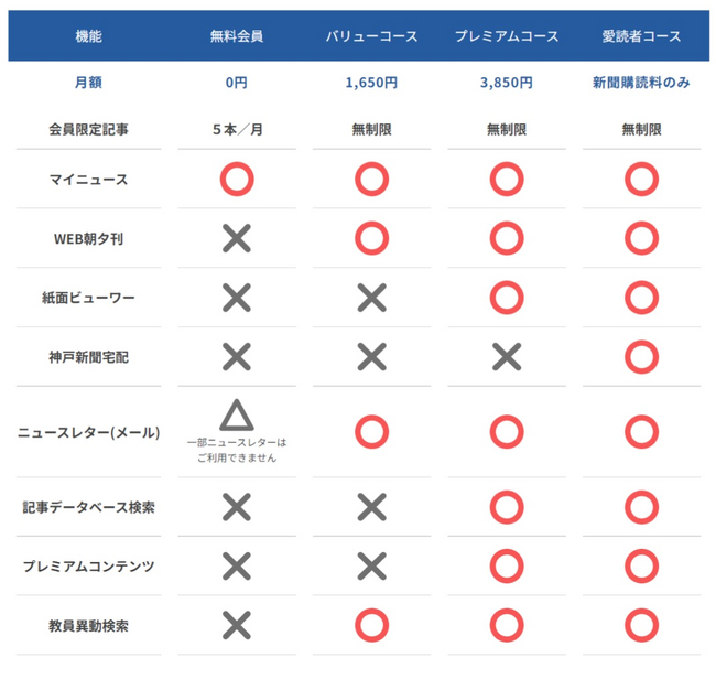 また神戸新聞読者は、追加料金なしですべてのコンテンツ、機能が利用できる「愛読者コース」への登録が可能。一部の会員限定記事が、月に5本まで読める「無料会員」も設けます。