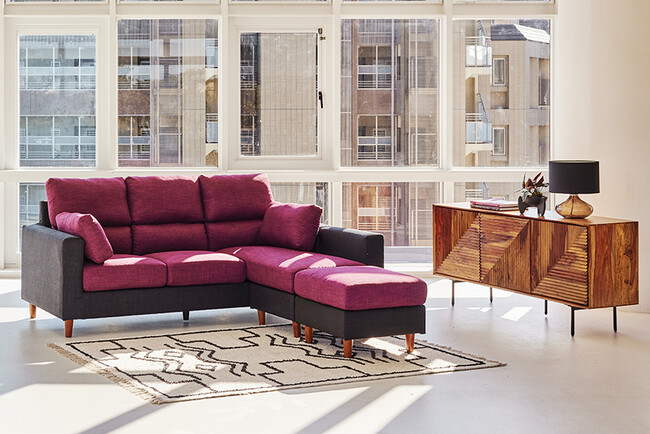 パープルとブラックの配色がモダンなカウチソファーと、扉のデザインとアイアンレッグが印象的なサイドボードがミッドセンチュリーの雰囲気を感じさせます。“モダン”の中にも“北欧風”が感じられるのは、ソファーのファブリック生地と木製の脚が効いているからでしょう。