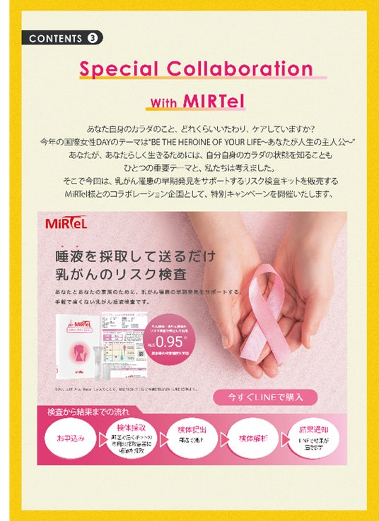 株式会社ミルテル(本社:広島県広島市、代表取締役社長:加藤 俊也 以下、ミルテル)は、女性専用のフィットネスブティックスタジオを運営する株式会社LIFE CREATE(本社:北海道札幌市、代表取締役:前川 彩香、以下、LIFE CREATE)の国際女性デー企画「BE THE HEROINE OF YOUR LIFE ~あなたが人生の主人公~」の思いに賛同し、LINE完結型のリスク検査「スキャンテスト 乳がん」のコラボレーション販売を開始いたしました。■コラボレーション概要