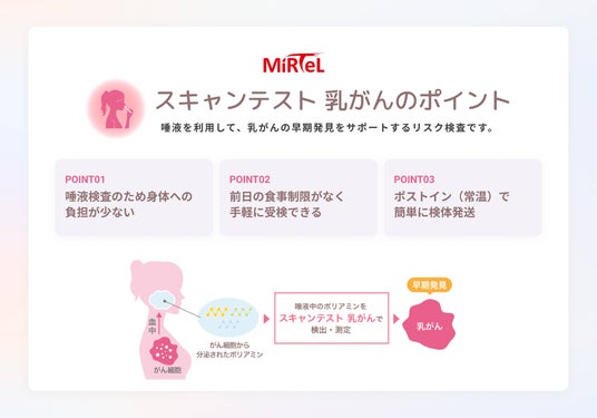 詳しくはこちら⇒ https://www.mirtel.co.jp/2c-bc-scantest/※スキャンテスト 乳がんはリスク検査であり、確定診断をするものではありません。