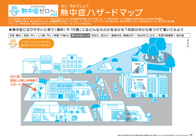 熱中症は環境、からだ、行動などさまざまな条件のもとに引き起こされます。身近な環境の中で、熱中症になりそうな場所を認識すること、熱中症にならないためには「何が」「どのように」良いのか、考えることが大切です。熱中症ハザードマップは、例示されるマップの余白に、その状況で注意すべき各ポイントや予防策を考えて、直接書き込めるワークシートとしました。
