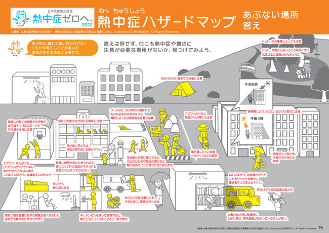 そこで、熱中症に注意が必要な場所、条件などを子ども自身で考え、また予防・対策につながる行動を身につけてもらうツールとして、熱中症ハザードマップを作成しました。ご家庭などで印刷して活用いただけます。