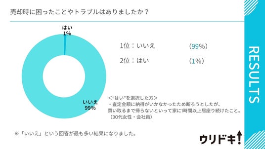 『困ったことやトラブルの内容』に関しては、「査定金額に納得がいかなかったため断ろうとしたが、買い取るまで帰らないといって家に1時間以上居座り続けたこと。」でした。