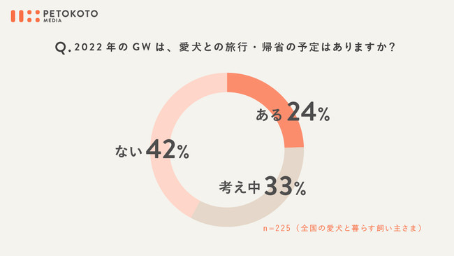 ペットライフメディア「PETOKOTO MEDIA」(https://petokoto.com)などを展開する、株式会社PETOKOTO(代表取締役社長:大久保泰介、本社:東京都新宿区)は、全国の犬と暮らす225名を対象に「PETOKOTO」および公式SNSなどで「愛犬との旅行に関する意識調査」を2022年4月9日~4月15日に実施しました。