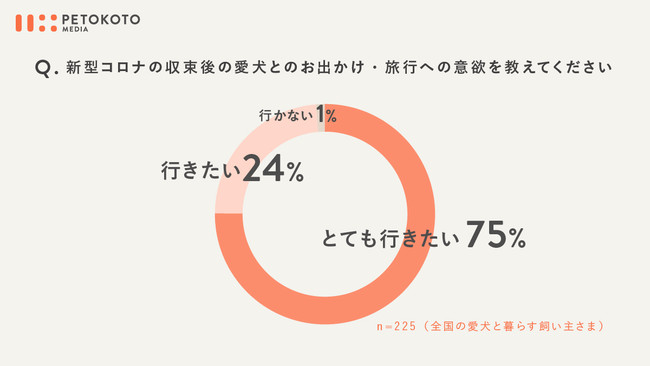 新型コロナの収束後の愛犬とのお出かけ・旅行への意欲についてのアンケートでは、75%の飼い主さんが強い意欲があると回答しました。