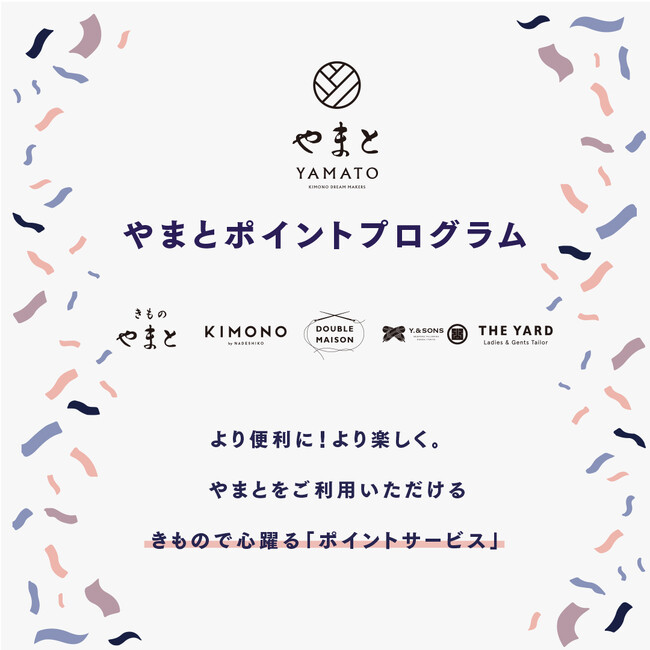 株式会社やまと(本社:東京都渋谷区、代表取締役:⽮嶋孝行)は、展開するきものブランドの店頭で利用できる《やまとポイントプログラム》を開始しましたのでお知らせします。きものやまと、KIMONO by NADESHIKO、Y.&SONS、THE YARD、DOUBLE MAISONの全店舗での利用が可能です。