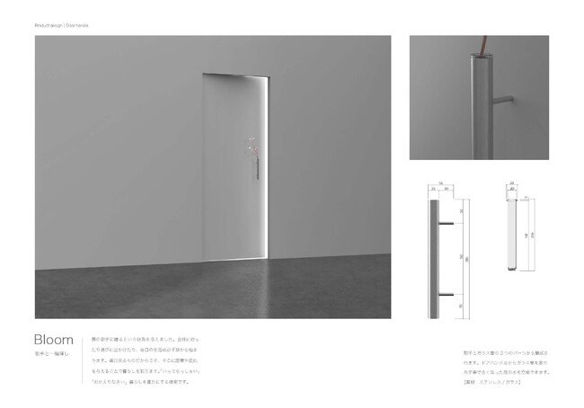 扉の取手に飾るという行為を与えました。会社に行ったり遊びに出かけたり、毎日の生活は必ず扉から始まります。毎日見るものだからこそ、そこに愛着や変化を与えることで、くらしを彩ります。「いってらっしゃい」「おかえりなさい」くらしを豊かにする提案です。