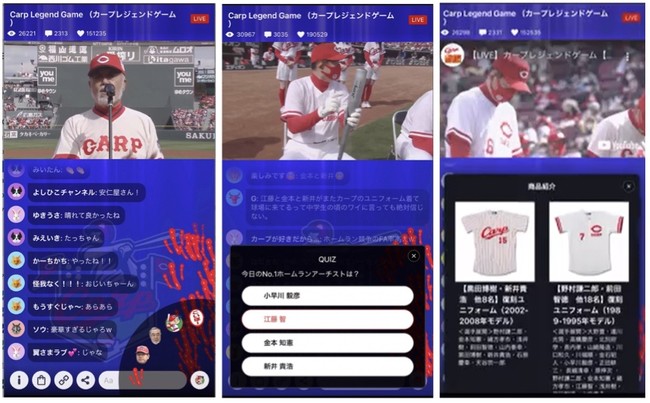 【実際の配信画面(左から):オリジナルスタンプとファンコメント、クイズ、グッズ販売】