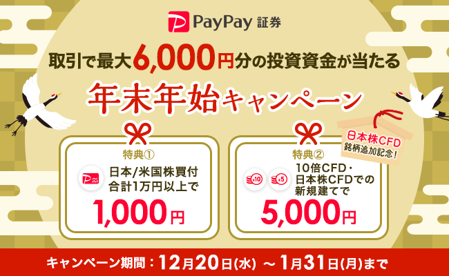 「資産運用を、より身近に。」をミッションに運営するスマホ証券 PayPay証券株式会社(東京都港区、代表取締役:内山 昌秋、以下「PayPay証券」)はPayPay証券初となるCFDの銘柄追加を記念し、期間内に対象取引をされたお客さまを対象に「取引で最大6,000円が当たる!年末年始キャンペーン」を2021年12月20日(月)から2022年1月31日(月)まで実施致します。