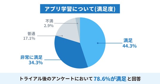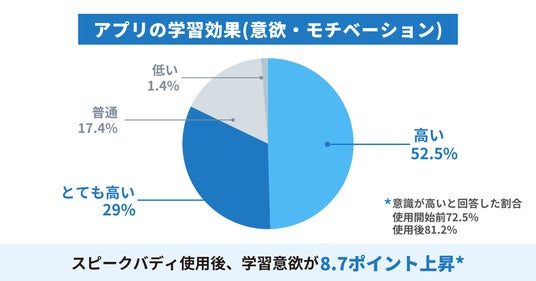 トライアル後のアンケートでは、78.6%がアプリの学習に満足と回答し、英語学習に対する意欲がスピークバディ使用後に8.7ポイント上昇しました。
