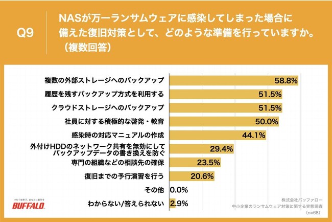 Q8で「十分に行っている」「やや行っている」と回答した方に、「Q9.NASが万一ランサムウェアに感染してしまった場合に備えた復旧対策として、どのような準備を行っていますか。(複数回答)」(n=68)と質問したところ、「複数の外部ストレージへのバックアップ」が58.8%、「履歴を残すバックアップ方式を利用する」が51.5%、「クラウドストレージへのバックアップ」が51.5%という回答となりました。