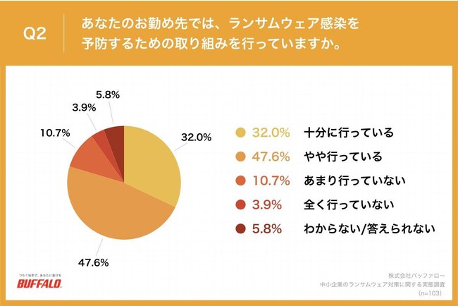 「Q2.あなたのお勤め先では、ランサムウェア感染を予防するための取り組みを行っていますか。」(n=103)と質問したところ、「十分に行っている」が32.0%、「やや行っている」が47.6%という回答となりました。