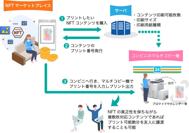 各マーケットプレイスで対応のNFTコンテンツを購入すると、購入ユーザーの端末にコンテンツとともにプリント番号が配信されます。ユーザーはコンビニのマルチコピー機にプリント番号を入力し、NFTコンテンツをプリントします。複数枚のプリントに対応しているコンテンツの場合、プリント枚数を友人などに譲渡することもできます。