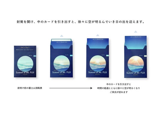 中のカードを引き出すごとに丸窓の景色が明るくなり、「ご来光」が体感できる仕組みとなっています。