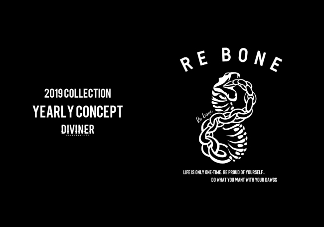 DIVINERが大切にする価値観が“死生観”であるからこそ、ブランドアイコンは「骨(Bone)」です。そしてブランド創設から10年を境目に、ブランドの新たなコレクションテーマ「ReBone」を発表。10年目でルーツを回帰し、2019年はこれまでのルーツを背負い、そして新たなルーツを切り開くというブランドの挑戦を、「生まれ変わり」という意味の“Reborn”と、DIVINERの死生観=“Bone”をかけ合わせた「ReBone」でスタートいたします。