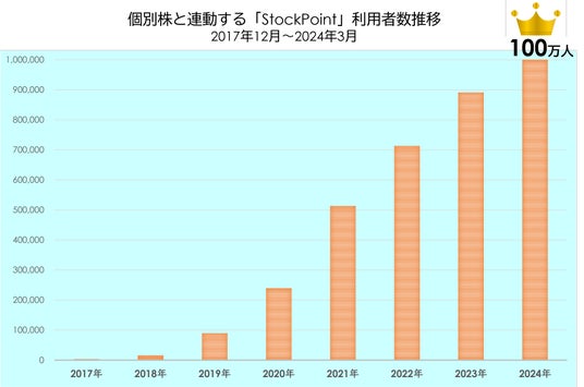 STOCK POINT 株式会社(本社:東京都港区、代表取締役社長:美好 琢磨、以下「STOCK POINT」)は、当社が運営するポイント運用サービス「StockPoint」を含む、『株価連動型ポイント運用システム』を活用したサービスの累計利用者数※-1が100万人を突破したことをお知らせ致します。