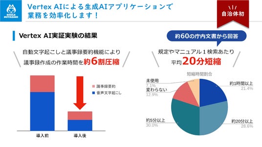 Google Cloudの生成AIサービス「Vertex AI」を活用する、自治体初の試みとなるこの実証実験では、約100名の職員が活用し、議事録作成や内部文書検索などの業務で大幅な時間削減を実現しました。宮崎市は、10月からの全庁的な生成AIの導入により、職員の負担を軽減し、市民サービスの向上に繋げていきます。