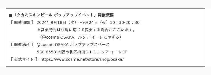 東京・表参道にある美容皮膚の現場で、長年にわたり肌と向き合ってきた経験から誕生したスキンケアブランド「タカミ」(本社:東京都新宿区、 www.takami-labo.com) は、「タカミスキンピール ポップアップイベント」を2024年9月18日(水)~9月24日(火)の7日間、@cosme OSAKA(アットコスメオーサカ)にて期間限定で開催します。