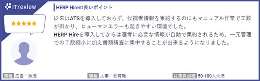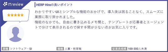 この度『HERP Hire』は「ITreview Grid Award 2024 Summer」の採用管理システム(ATS)部門において「Leader」を受賞しました。また同部門では、「使いやすさ」「導入のしやすさ」「管理のしやすさ」「応募者情報の管理機能」でNo.1を獲得しています。