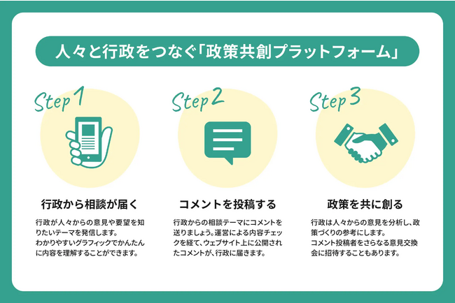 人々と行政がともに社会を創るための「政策共創プラットフォーム」です。オンラインで気軽に、行政にアイデアを届けることができます。国民や住民の行政に対する意見や要望を聴く活動(=広聴)をデジタル時代に対応した新たな仕組みへアップデートし、人々の幸せな暮らしに貢献します。