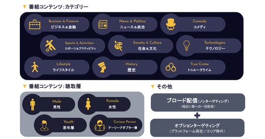 「グローバルオーディオアドネットワーク」で配信可能なコンテンツとパブリッシャーの例
