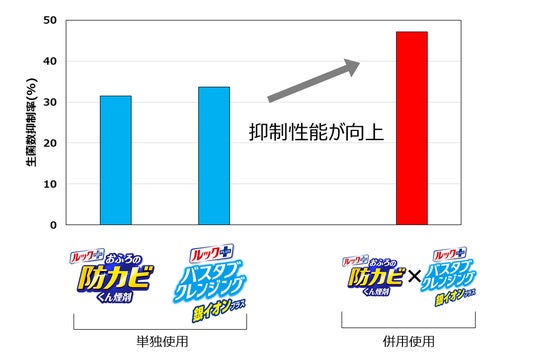 ピンク汚れ予防効果について実験したところ、この2品を併用することで、ピンク汚れ予防効果が高まることを確認しました。『ルックプラス おふろの防カビくん煙剤』は浴室丸ごと、『ルックプラス バスタブクレンジング銀イオンプラス』は排水溝や床など特に気になる部分にご使用いただくことで、単品使用よりもより高い効果が得られます。