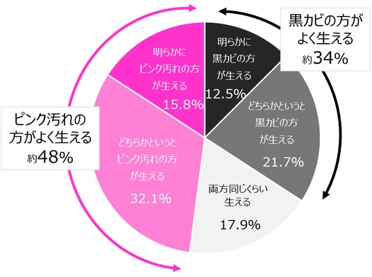 自宅の浴室に発生する汚れを調査したところ、黒カビとピンク汚れの両方が発生する人と比較して、 いずれか一方のみが発生しやすいと感じている人が多いことが分かりました。「両方が同じくらい発生 する」と感じている人が17.9%であるのに対し、「黒カビの方がよく発生する」と感じている人は34%、 「ピンク汚れの方がよく発生する」と感じている人は48%と、最も多い結果でした※4。