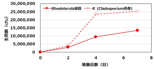 Cladosporiumの共存がRhodotorulaの生育に与える影響