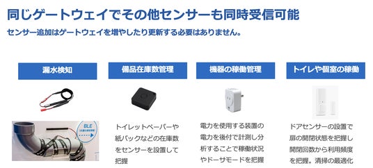 「Salta」で取得した圧力データだけでなく、同一システム上で電力、温度、湿度、振動、開閉などのセンサーデータも一元管理できるため、工場やインフラ、ビル設備の段階的なIoT化を柔軟にサポートします。