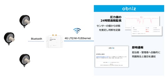 今回の連携では、「Salta」で読み取った圧力計の針の位置情報をobniz Nowが自動認識し、クラウド上にリアルタイムで送信。スマートフォンやPCから、水圧・ガス圧の状況を24時間いつでも遠隔で確認可能となります。