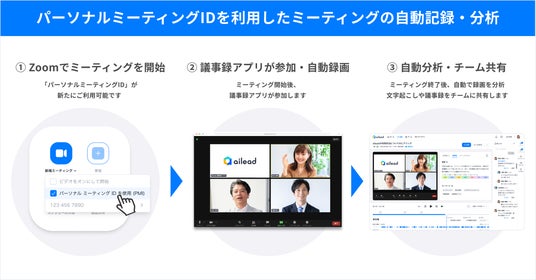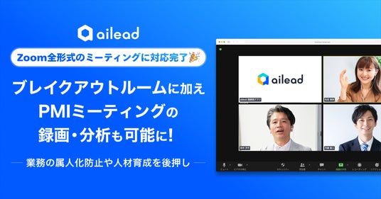 株式会社ailead(本社:東京都港区、代表取締役:杉山大幹)が提供するクラウド商談解析ソフト「ailead(エーアイリード)」は、Zoomとの連携機能を拡張し、新たにPMIミーティング(パーソナルミーティングID)を利用したミーティングでも自動的に録画・分析できる機能を追加したことをお知らせいたします。